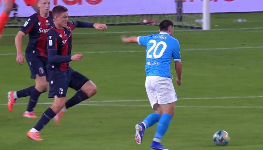 比赛进行到第31分钟,那不勒斯再次发起左路进攻,麦克托米奈突入禁区倒三角似传似射,被博洛尼亚门将拉瓦利亚奋力化解。第38分钟,右路波利塔诺持球横传给内雷斯,内雷斯转身摆脱防守后持续内切到禁区边缘,随即左脚一记大力弧线射门,皮球精准飞入球门远端死角,帮助那不勒斯1:0领先。